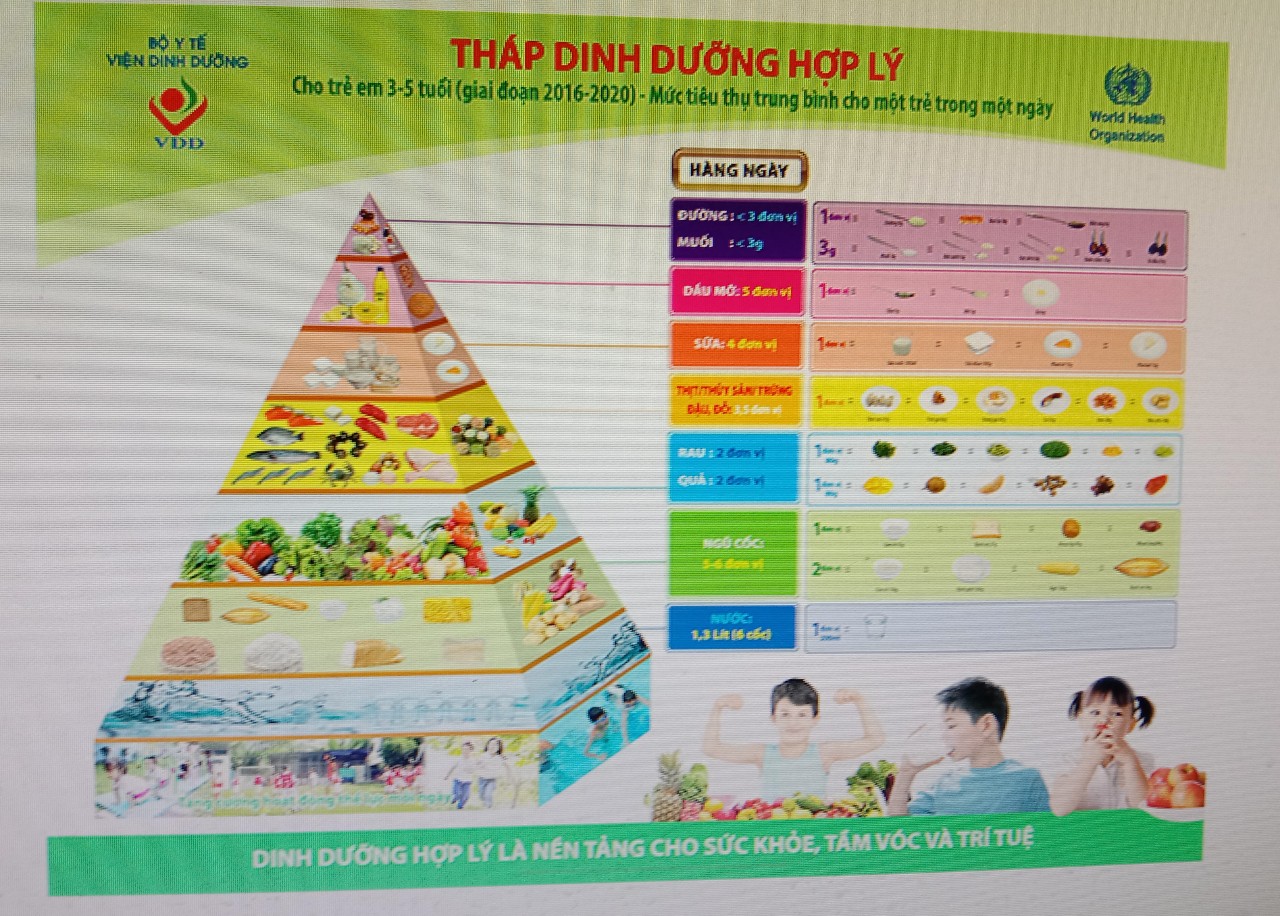 Trẻ ăn cùng với gia đình: 3 bữa chính và 1-2 bữa phụ. Theo Tháp dinh dưỡng hợp lý cho trẻ từ 3-5 tuổi, số lượng thực phẩm khuyến nghị cho 1 ngày ăn của trẻ như sau: