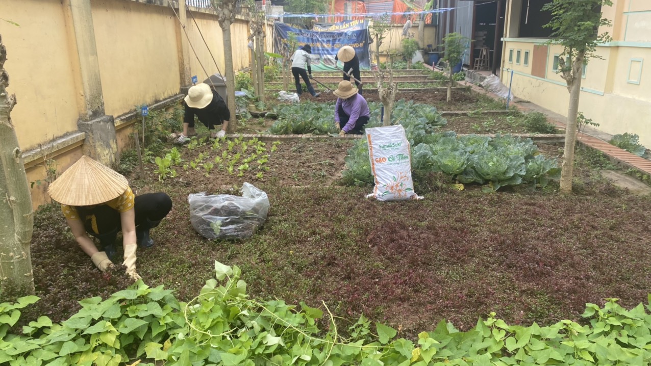 Không chỉ góp phần tạo cảnh quan môi trường “xanh - sạch - đẹp”, mô hình " Trồng rau sạch" đã được nhà trường triển khai trong nhiều năm. Và để chuẩn bị đón HS quay trở lại trường, BGH đã chỉ đạo tổ bếp cải tạo đất và gieo, trồng các loại rau theo mùa vụ như rau muống, mồng tơi, rau cải, rau rền đỏ.... giúp cải thiện và nâng cao chất lượng nguồn rau sạch, đảm bảo an toàn vệ sinh thực phẩm.