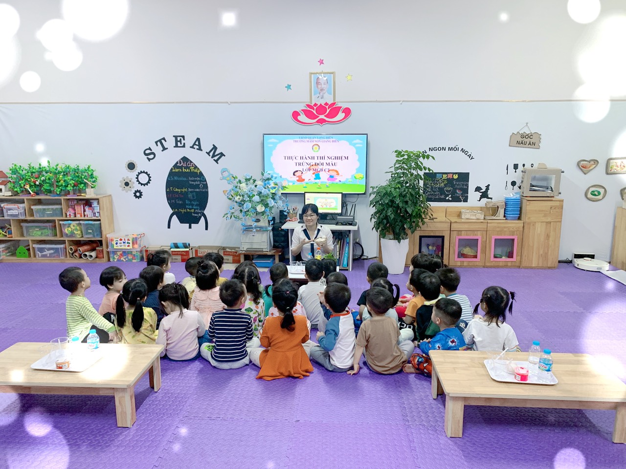 Với các nguyên liệu như: Dấm, nước lọc, trứng gà, màu thực phẩm các cô đã tổ chức cho các con làm thí nghiệm đổi màu quả trứng, các con rất thích thú khi nhìn thấy quả trứng trong cốc dấm nổi lên lắc lư. Hãy cùng làm thí nghiệm với các bạn nhỏ MGB C3 xem điều gì xảy ra nhé.