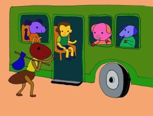 Kiến con leo lên xe buýt. Kiến muốn vào rừng xanh thăm bà ngoại. Trên xe đã có Dê con, Chó con, Khỉ con và Lợn con ngồi. Có bạn trong bọn họ vào rừng hái nấm, có bạn vào rừng chơi trốn tìm, có bạn đến dạo chơi trên bờ hồ trong rừng.