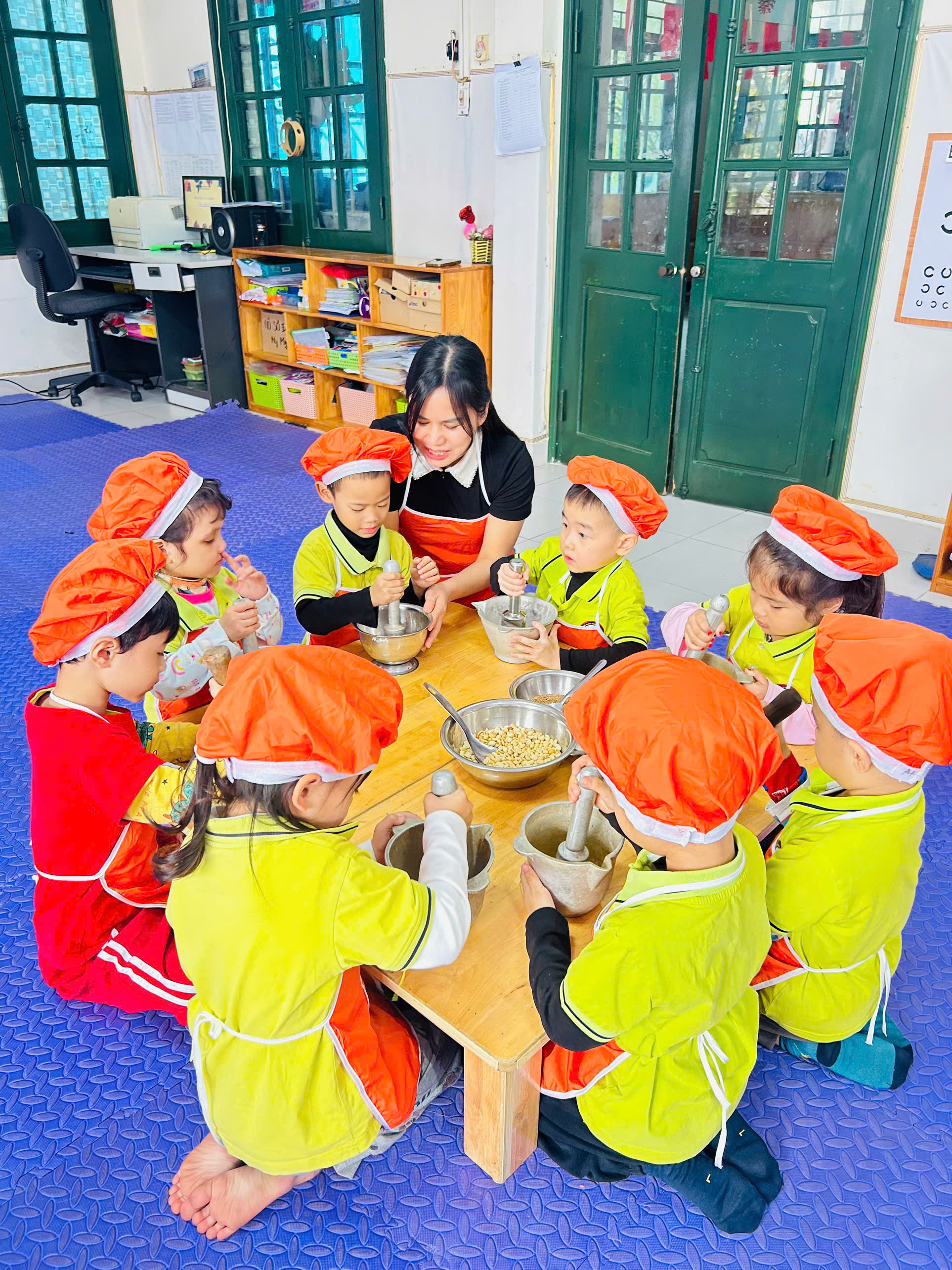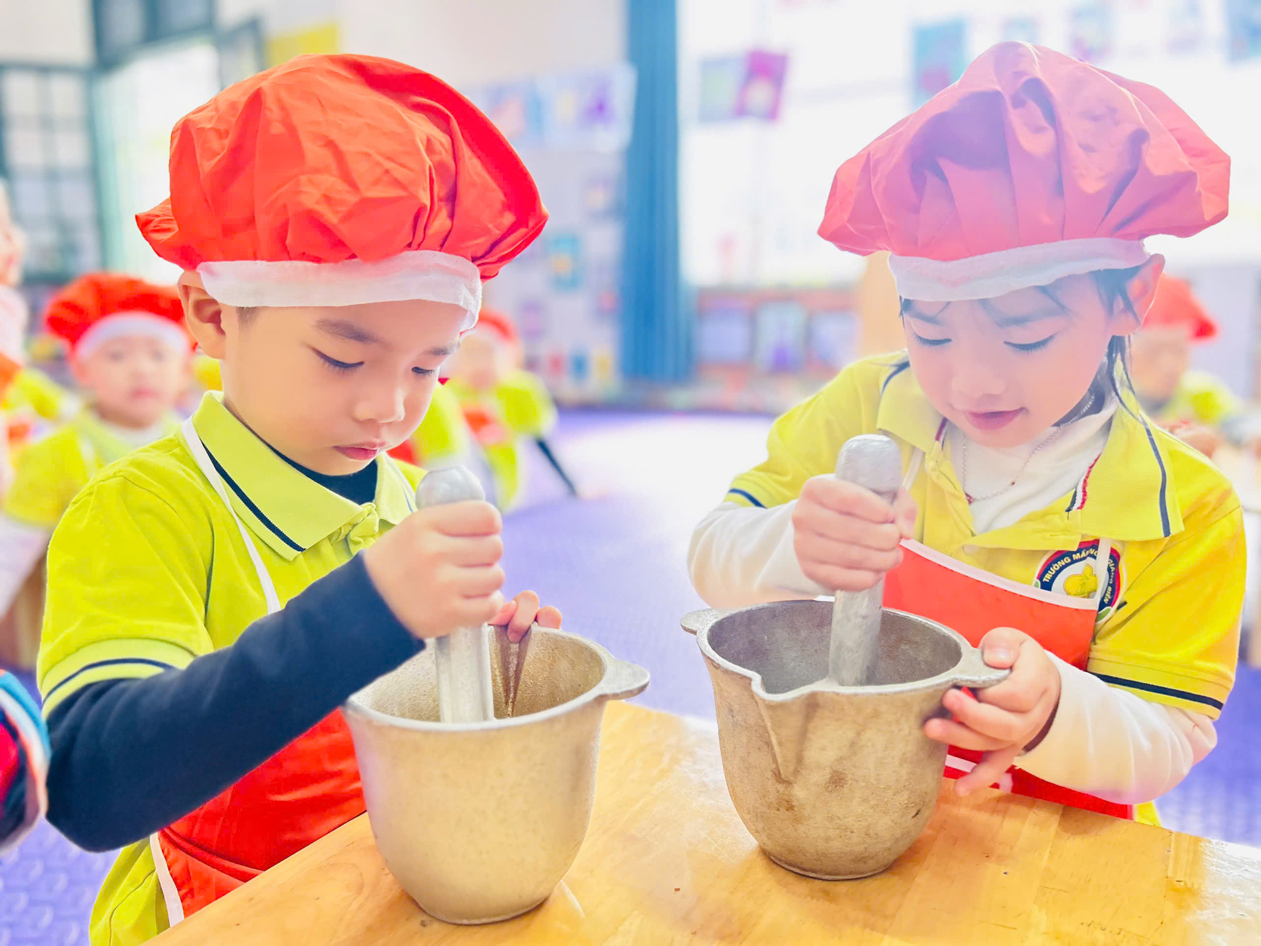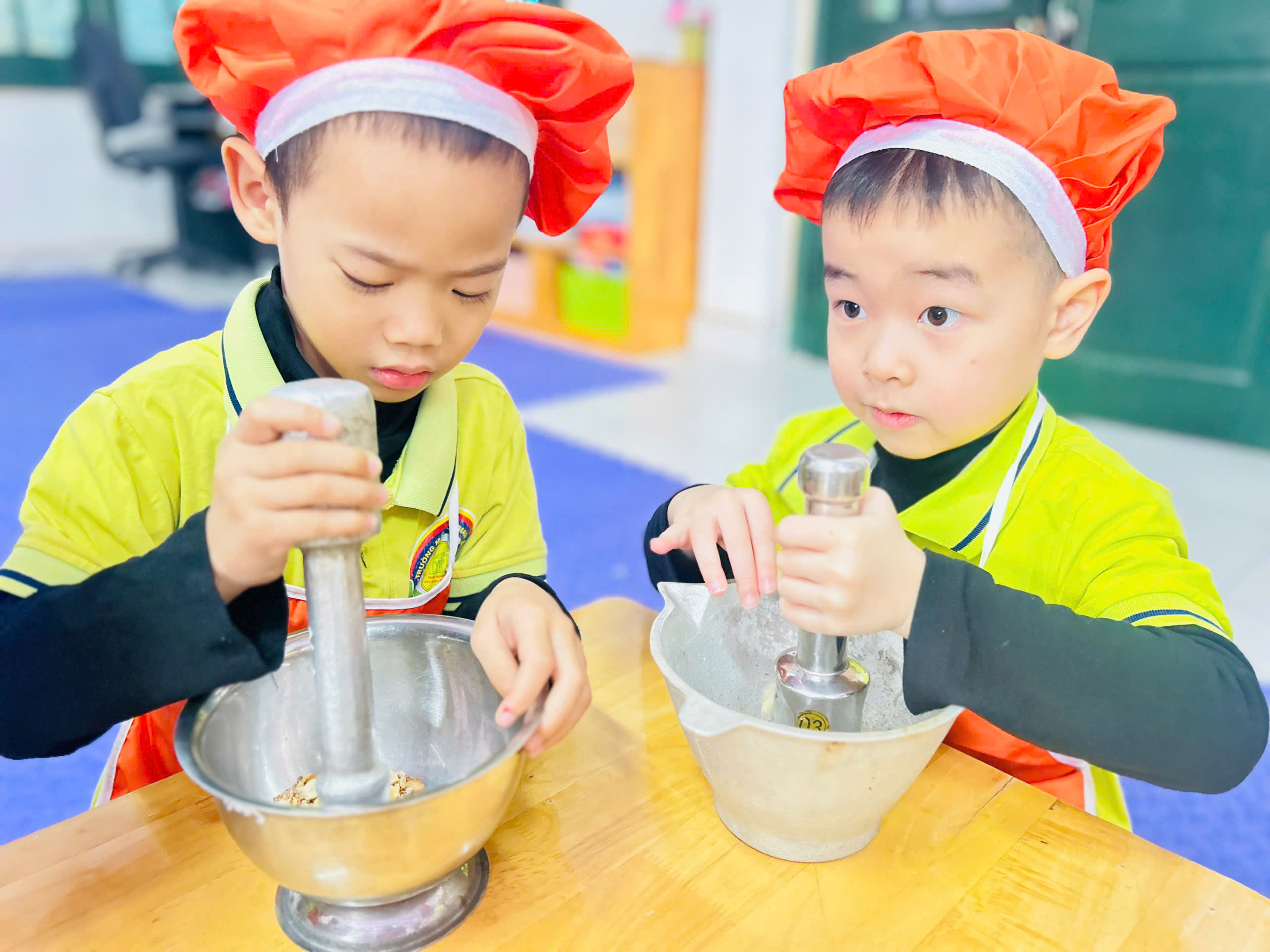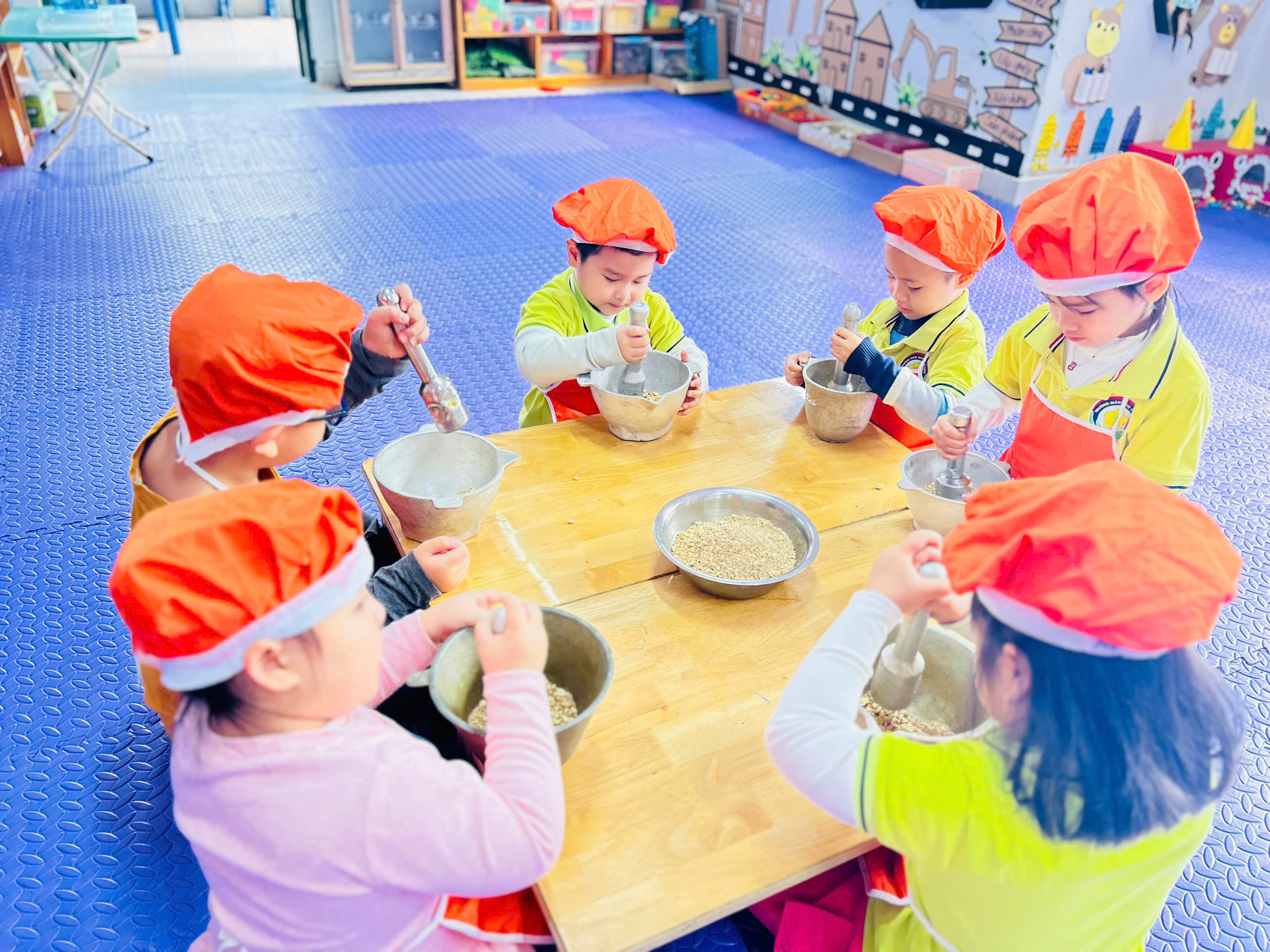 Dưới sự hướng dẫn của cô giáo 👩🏫, các bé được quan sát nguyên liệu như: vừng rang thơm 🥜, muối trắng 🧂 cùng dụng cụ cối – chày gỗ. Các con hào hứng trải nghiệm giã vừng, trộn muối và đảo đều hỗn hợp để tạo nên món muối vừng thơm ngon do chính tay mình làm ra. 🍽️