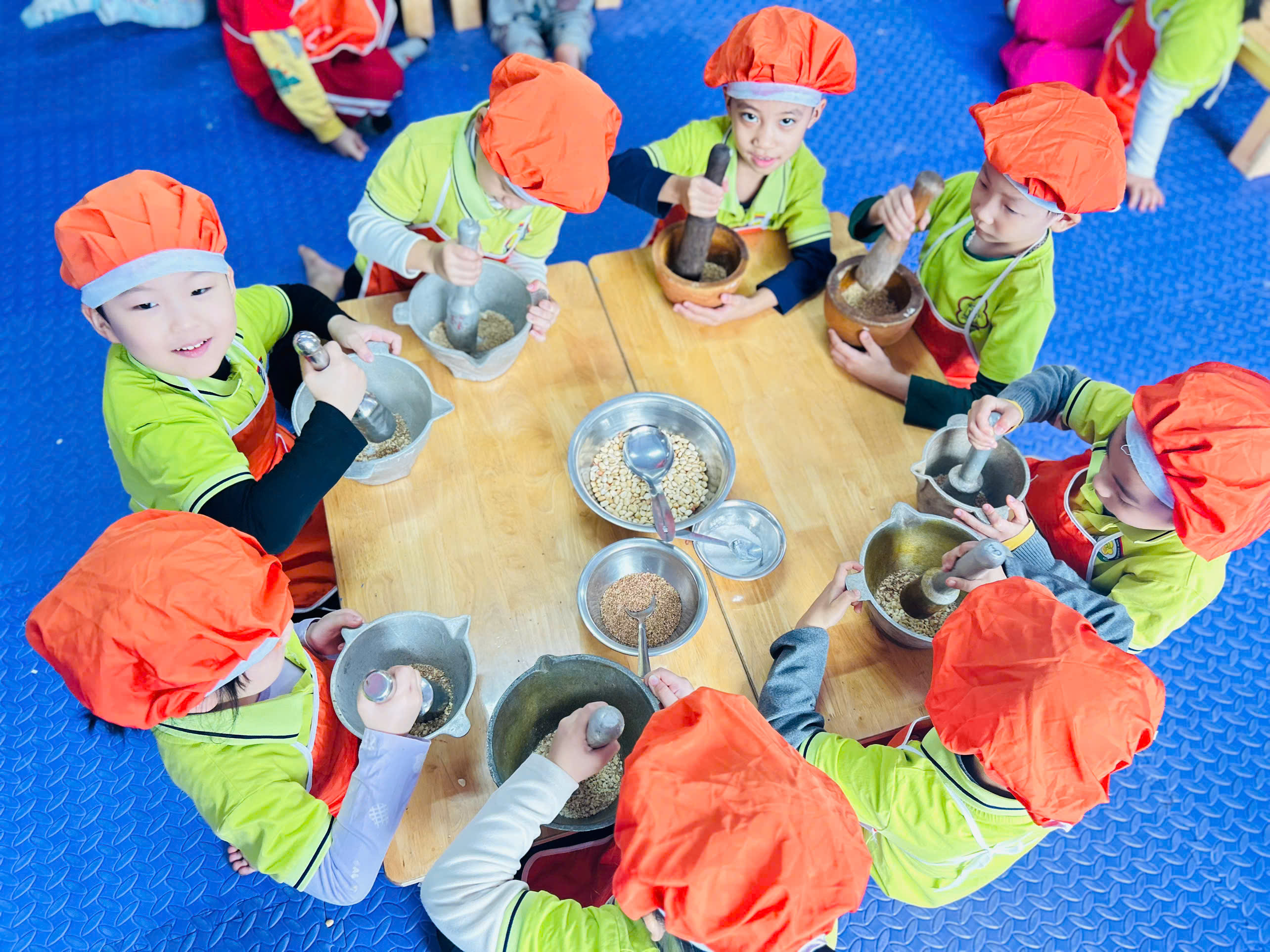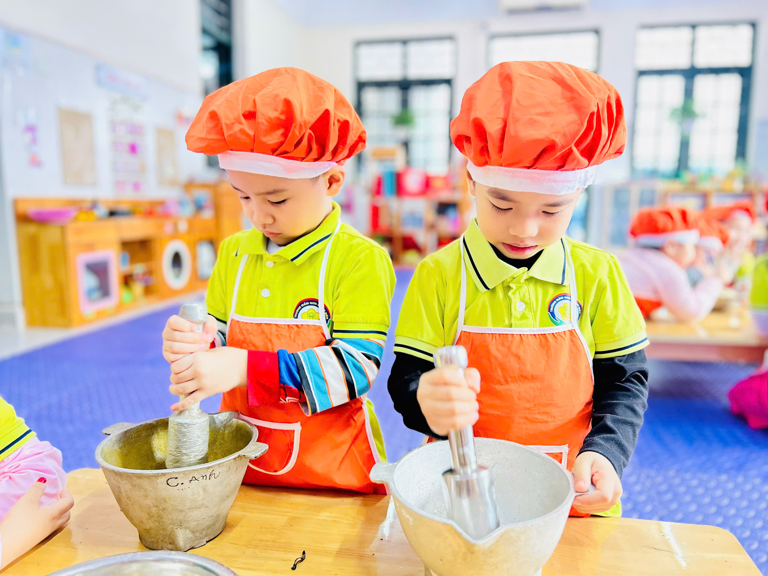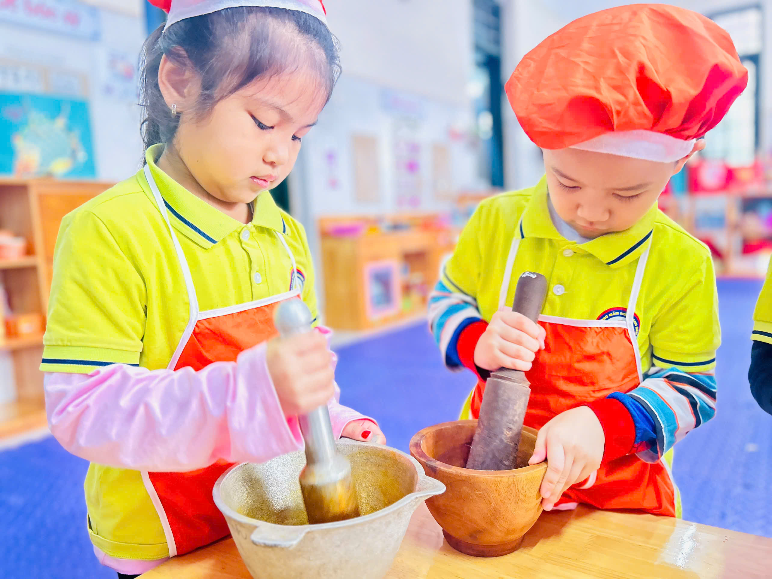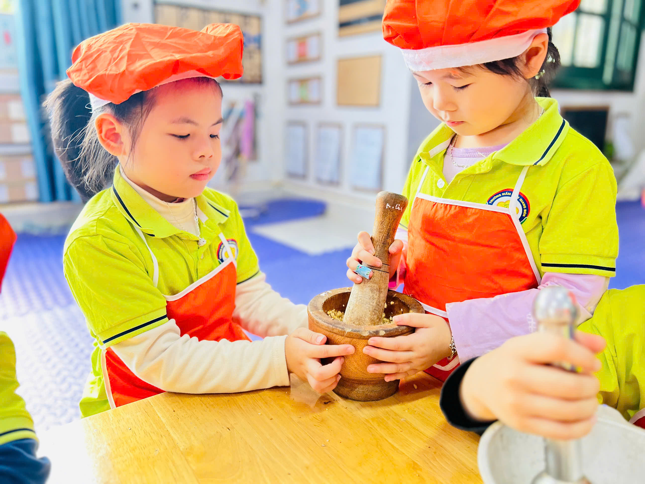 Dưới sự hướng dẫn của cô giáo 👩🏫, các bé được quan sát nguyên liệu như: vừng rang thơm 🥜, muối trắng 🧂 cùng dụng cụ cối – chày gỗ. Các con hào hứng trải nghiệm giã vừng, trộn muối và đảo đều hỗn hợp để tạo nên món muối vừng thơm ngon do chính tay mình làm ra. 🍽️
