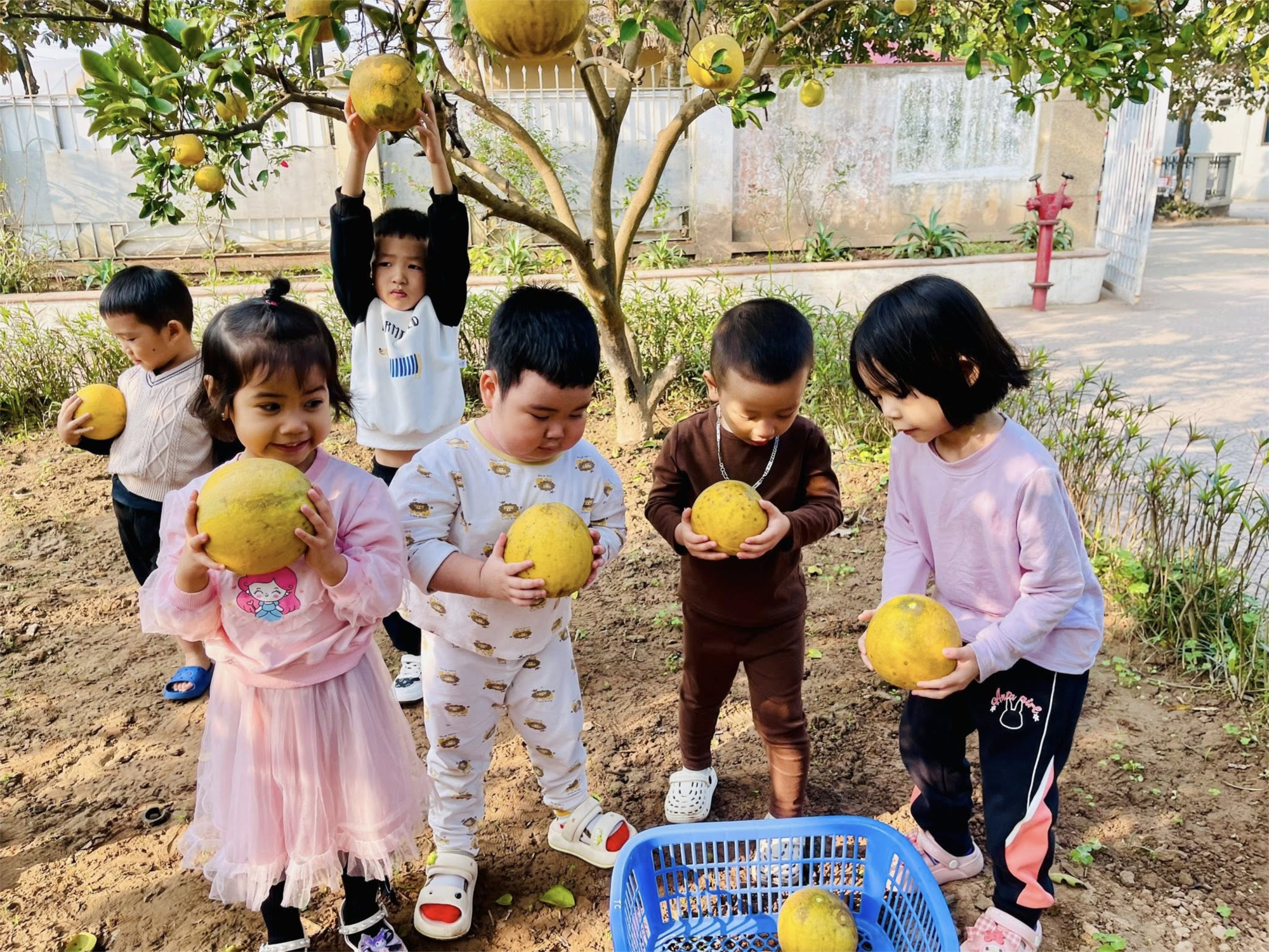 quả bưởi to sai lúc lỉu, thơm phức, vàng óng đã thu hút sự tò mò, thích thú của trẻ. Khi các bé được tự tay thu hoạch những quả bưởi chín vàng và được cùng nhau trò chuyện về những quả bưởi trong vườn trường bé nào cũng hào hứng, vui vẻ. Thông qua hoạt động này đã tạo cho trẻ có được môi trường giáo dục thân thiện, lành mạnh, thực tế giúp trẻ rèn luyện kỹ năng sống, ý thức bảo vệ thiên nhiên, môi trường xung quanh trẻ. Ngoài quả ra các bé đừng quên là vườn trường chúng mình còn có rất nhiều loại rau xanh nữa đấy! Các bé đi học đông đủ để cùng các cô cùng nhau đi thu hoạch rau nữa nhé! Đến trường MN Giang Biên thật là thích các bé nhỉ!