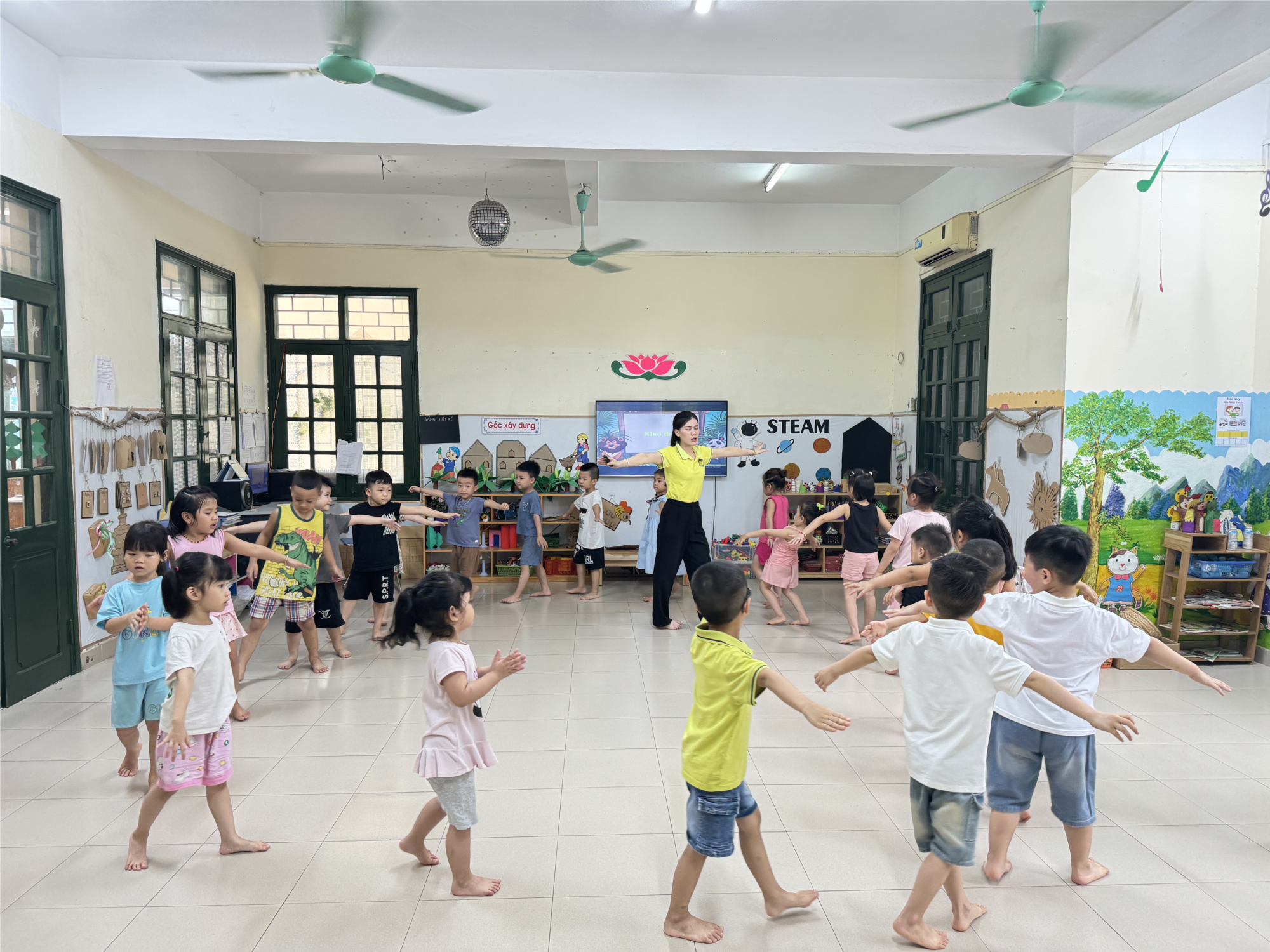 Các bé trong độ tuổi mầm non là giai đoạn cơ thể phát triển nhanh, mềm dẻo. Tuy nhiên sức đề kháng lại rất yếu, các mô cơ, mô mạch, cơ quan bên trong vẫn chưa được phát triển hoàn chỉnh. Ngoài việc được ăn uống để bổ sung dinh dưỡng thì việc phát triển vận động cho trẻ mầm non cũng cần được ba mẹ lưu tâm. Ba mẹ để bé luyện tập việc giữ thăng bằng bằng hai chân, sau đó cho bé di chuyển bằng cách: đi tiến về phía trước, lùi về phía sau, đi ngang,… Để bé leo lên và đi xuống cầu thang bằng những bước luân phiên và mang đồ vật lên và xuống cầu thang có sự dám sát của ba mẹ.Bé ném và bắt một quả bóng nhỏ bằng 2 cánh tay. Bé lái xe đạp ba bánh, xe đạp bốn bánh đi trên đường bằng phẳng, qua dốc thấp, vòng qua những góc rộng….Bé nhảy qua một sợi dây để cao 4cm, nhảy xuống từ một bậc thang dưới cùng hoặc từ một khối cao 20 cm mà không cần giúp đỡ của ba mẹ…Hyax cũng các bé lớp B1+ B2 cùng ôn lại vận động " Bò chui qua cổng " nhé