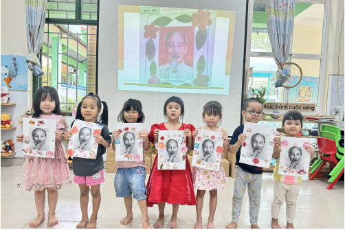 Để giúp những thế hệ mầm non tương lai đất nước hiểu rõ thêm về quê hương- đất nước mình cũng như về Bác, các cô giáo đã cho các bé tham gia nhiều hoạt động khác nhau như: Trò chuyện xem tranh ảnh về Bác, về quê hương Việt Nam. Hôm nay, trong giờ hoạt động học tạo hình, các con được cô cho trang trí khung ảnh Bác Hồ dưới sự hướng dẫn của cô giáo ,các con đã trang trí khung ảnh Bác Hồ thật là đẹp.