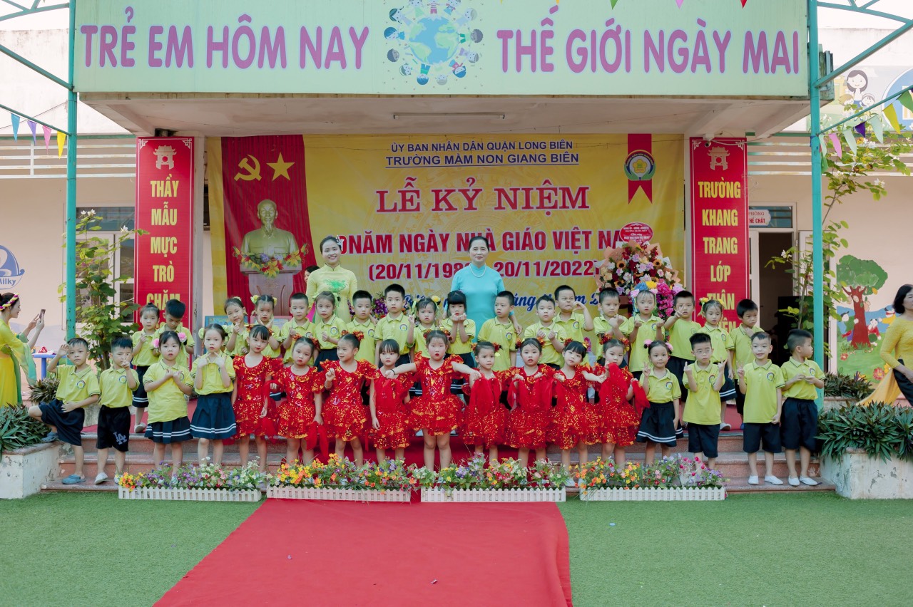 Hôm nay ngày 18/11/2022, trường mầm non giangbieen long trọng tổ chức lễ mít tinh kỷ niệm 40 năm ngày nhà giáo Việt Nam 20/11. Sau đây là 1 số hình ảnh cô và trò lớp MGL A4 tại buổi lễ: