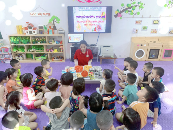 Lớp Mẫu giáo bé C3 trường mầm non Giang Biên đã tổ chức cho các con được tập làm nội trợ món “ Hoa quả dầm” với mong muốn tạo điều kiện để các con học được kĩ năng sống vì những trải nghiệm sẽ giúp các con phát triển tinh nhanh nhẹn, biết hợp tác chia sẻ, khéo léo, tỉ mỉ, gọn gàng ngăn nắp, ý thức tự giác và tinh thần tập thể nhằm giúp các con có được những hiểu biết về các món ăn hằng ngày, có những kĩ năng cơ bản trong việc chế biến món ăn, có thể tự mình tạo ra các món ăn đơn giản nhưng rất ngon và bổ dưỡng. Từ những loại quả như thanh long, dưa hấu, táo, xoài, sữa chua…. do cha mẹ các con ủng hộ, dưới sự chuẩn bị chu đáo và cách hướng dẫn của cô giáo, các con lớp Mẫu giáo bé C3 đã thể hiện món hoa quả dầm thật ngon và đẹp mắt. Đây là món ăn rất mát và đầy dinh dưỡng, bổ sung nhiều vitamin trong ngày hè.