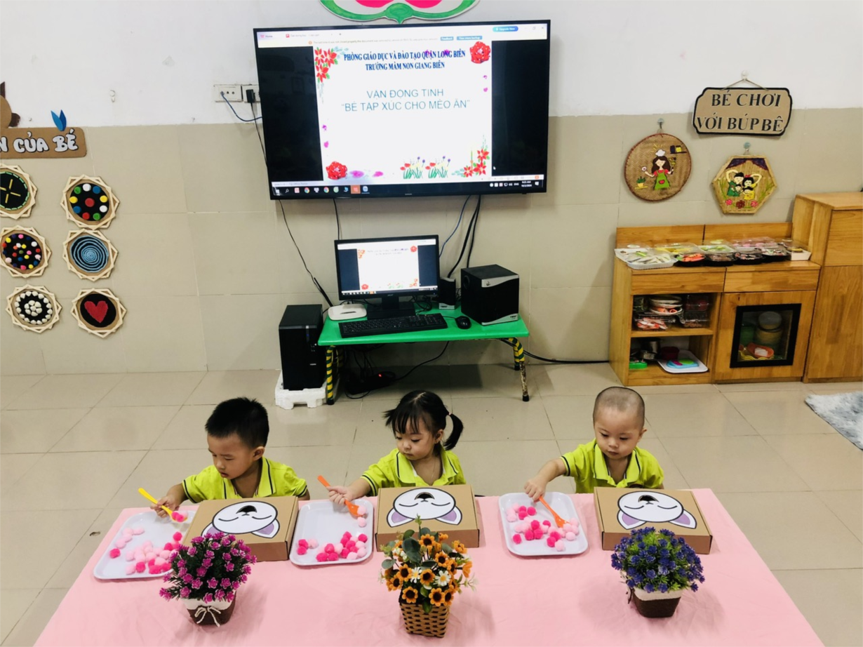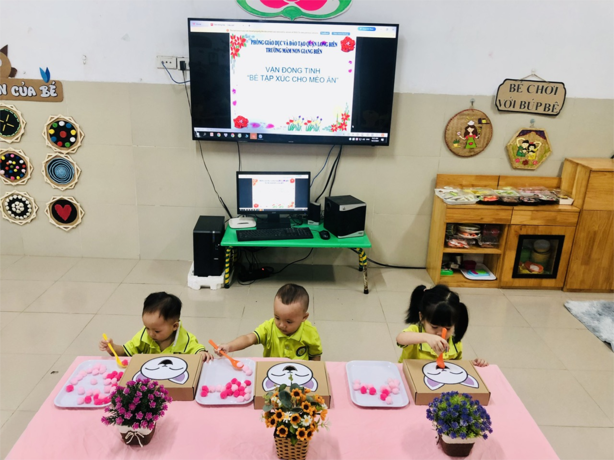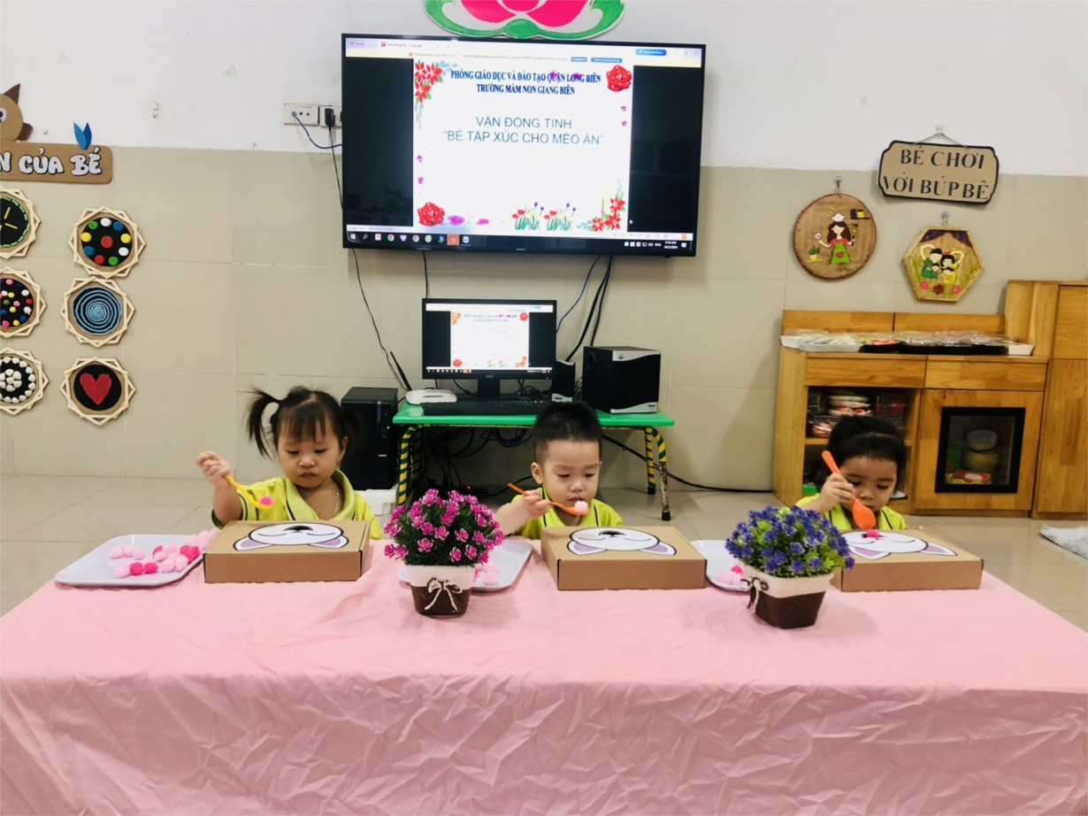 Các bạn nhỏ lớp NTD3 tập xúc thức ăn cho mèo