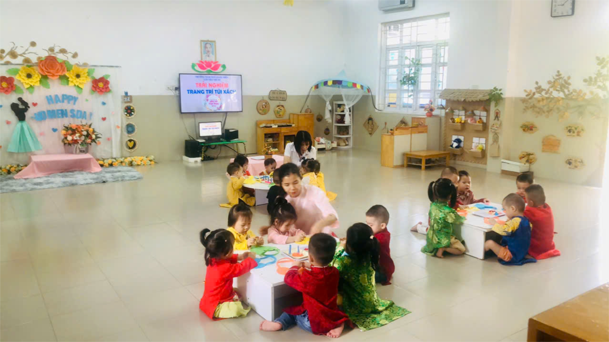 Các bé lớp NTD3 trang trí túi xách tặng bà, tặng mẹ