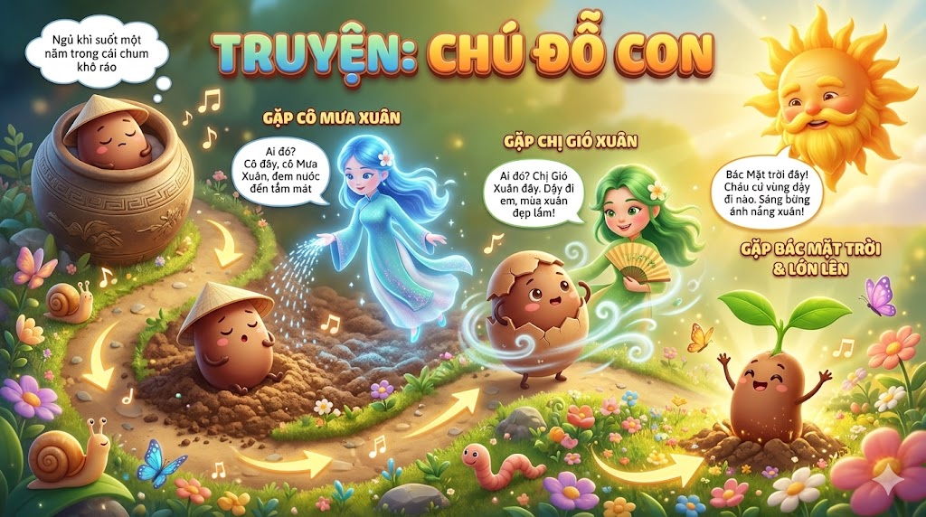 Một chú Đỗ con ngủ khì trong cái chum khô ráo và tối om suốt một năm. Một hôm tỉnh dậy chú thấy mình nằm giữa những hạt đất li ti xôm xốp. Chợt có tiếng lộp độp bên ngoài.