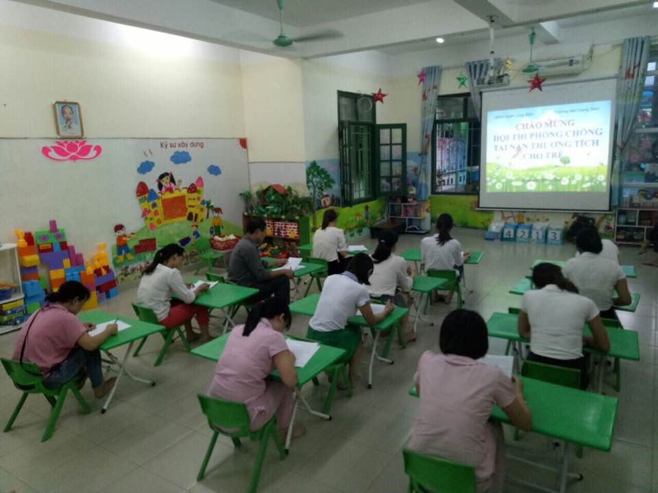 Để thực hiện đúng theo như kế hoạch nhà trường đã xây dựng vào chiều ngày 16/10 nhà trường đã triệu tập 100% các đồng chí giáo viên, nhân viên nuôi dưỡng của nhà trường về tham dự buổi tập huấn và tổ chức hội thi “ Phòng, chống tai nạn thương tích trong nhà trường” mỗi đồng chí tham dự thi thi 30 phút với 10 câu hỏi , hình thức thi trắc nghiệm . Trong quá trình làm bài các đồng chí đã nghiêm túc thực hiện theo đúng qui định