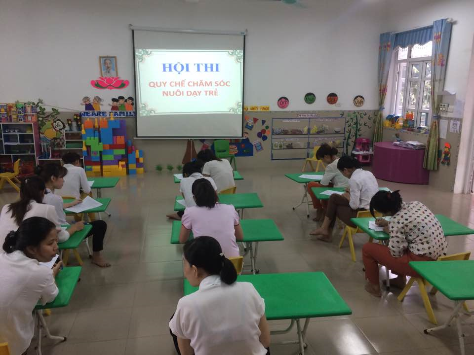Chiều ngày 10/10 nhà trường mầm non tổ chức hội thi lý thuyết tổng số có 51/61 đồng chí giáo viên, nhân viên nuôi dưỡng hưởng ứng . Thông qua hội thi giáo viên, nhân viên khắc sâu hơn vốn kiến thức, vận dụng vào trong hoạt động chăm sóc nuôi dưỡng trẻ hàng ngày một cách nghiêm túc có hiệu quả từ khâu đón trả trẻ, tổ chức các hoạt động giáo dục tổ chức giờ ăn ngủ, kỹ năng tổ chức hoạt động về sinh, kỹ năng xử lý các tình huống khi xảy ra tại lớp, nơi làm việc và không vi phạm những nội qui, qui định đối với giáo viên, nhân viên.